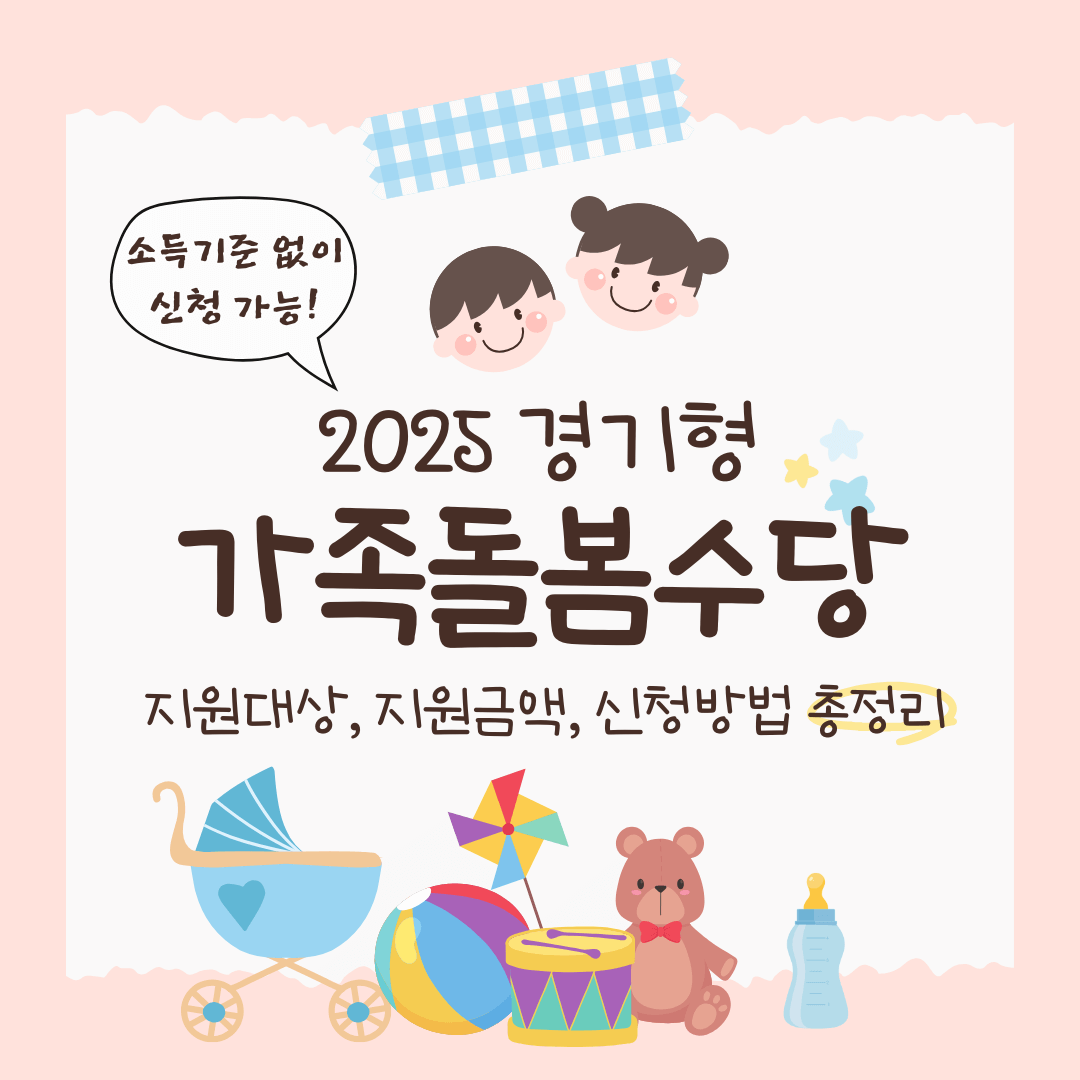 경기형-가족돌봄수당-총정리 안녕하세요. 오늘은 여러분들이 궁금해 하시는 경기형 가족돌봄수당에 대한 안내를 총정리해드리려고 합니다. 경기형 돌봄가족수당 지원 대상, 지원 금액, 그리고 신청 방법과 신청 기간에 대한 내용을 확인하실 수 있으시며, 신청시에 반드시 첨부해야 하는 서류 '돌봄조력자 위임장'까지 첨부파일로 안내해드리니 도움이 되시길 바랍니다.