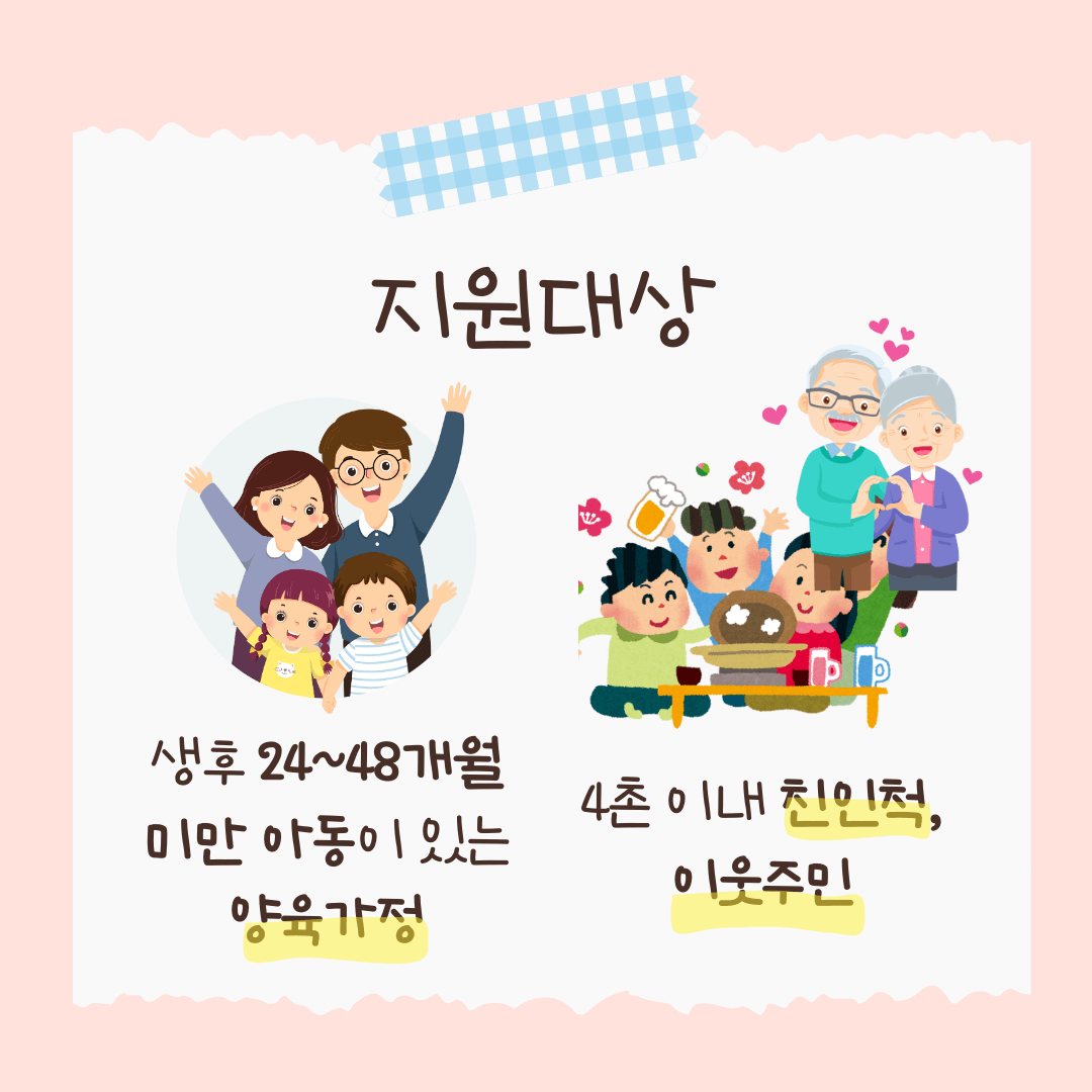 지원은 생후 24에서 48개월 사이의 아동이 있는 양육가정이며, 주민등록 등본상으로 위에 18개의 사전 협의된 지역에 거주하면서 맞벌이 등과 같은 이유로 양육 공백이 발생한 경우에 신청할 수 있습니다. 소득 제한은 따로 없기에 위 조건에 해당된다면 신청 대상이 됩니다.