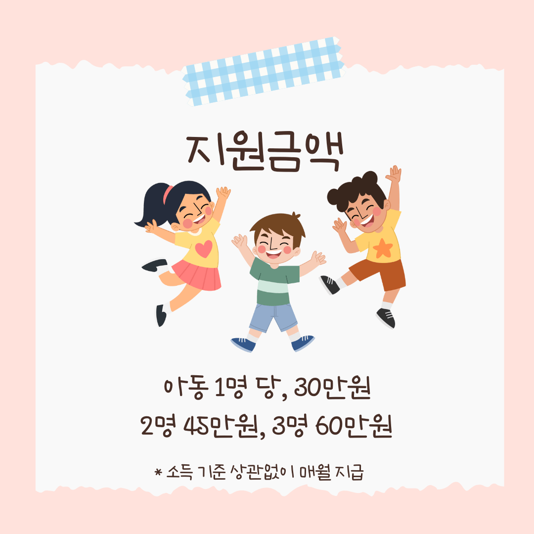 경기형-가족돌봄수당-지원금액 경기형 가족돌봄수당 지원금액은 아동 1명일 경우에 월 30만원, 2명은 월 45만원, 3명은 월 60만원이 지급됩니다. 매 월 지급된다는 것이 장점이며, 특히 소득 기준 상관없이 어느 가정에나 아동의 수에 따라 지원된다는 것이 특징입니다.