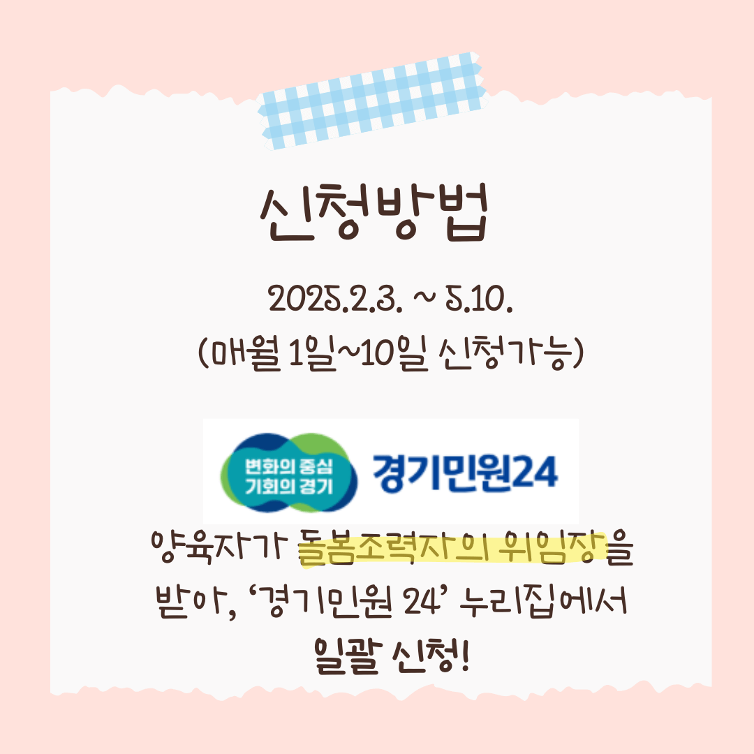경기형-가족돌봄수당-신청방법 경기형 가족돌봄수당은 매달 1일에서 10일사이에 신청이 가능하지만, 첫 신청인 2월은 2월3일부터 신청이 가능합니다. 신청할 때에는 양육자가 '돌봄조력자 위임장'을 작성하여, '경기민원 24'누리집에서 일괄적으로 신청하면 됩니다.