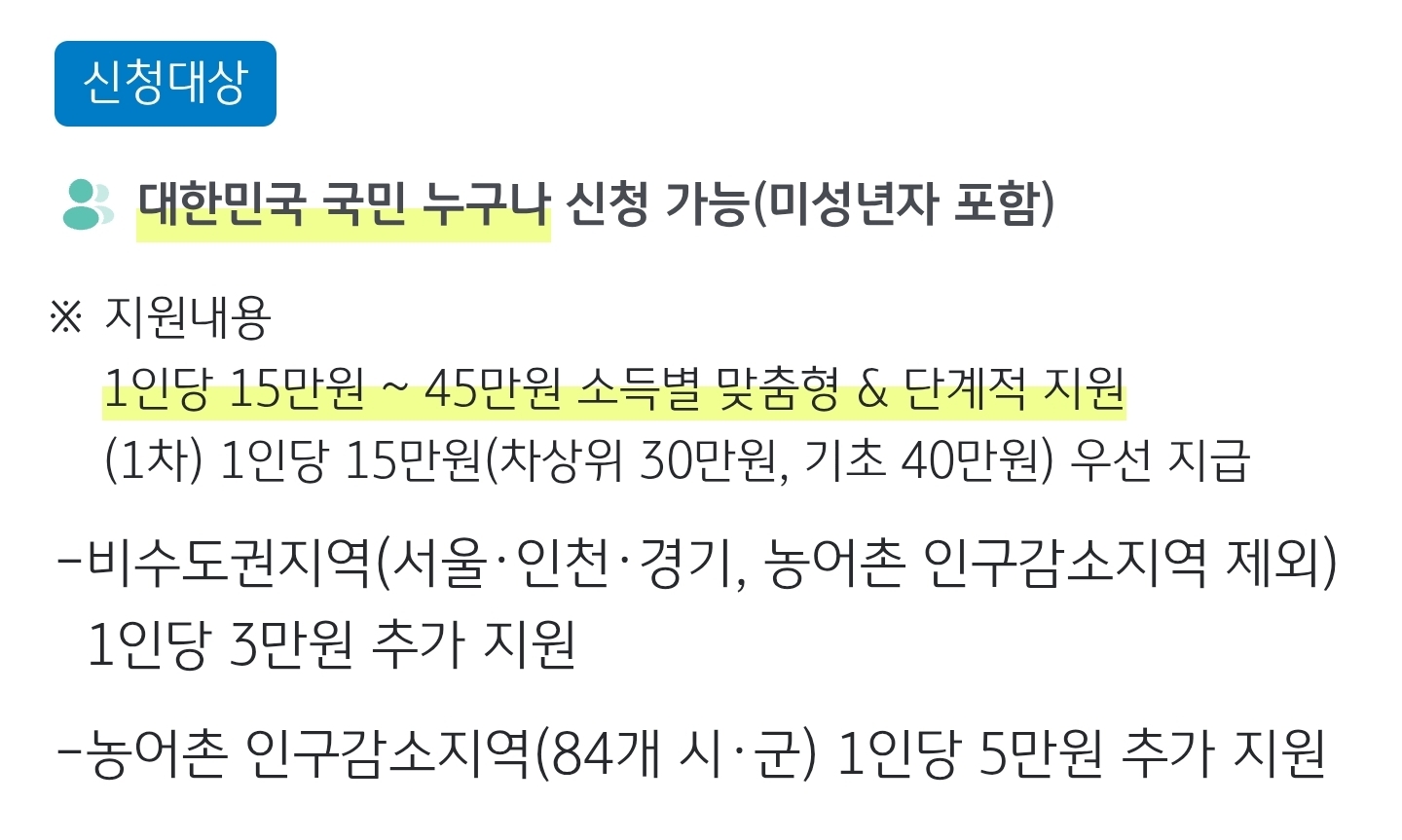 아기 민생회복 소비쿠폰 신청은 '엄마'가 신청할 때, 자동으로 신청인원에 2명으로 집계되어 신청이 됩니다. 아기가 태어난 년도 상관없이 신청인 '엄마'의 태어난 년도와 해당 신청일에 동시에 신청할 수 있습니다.2. 아기 민생회복 소비쿠폰 신청 금액