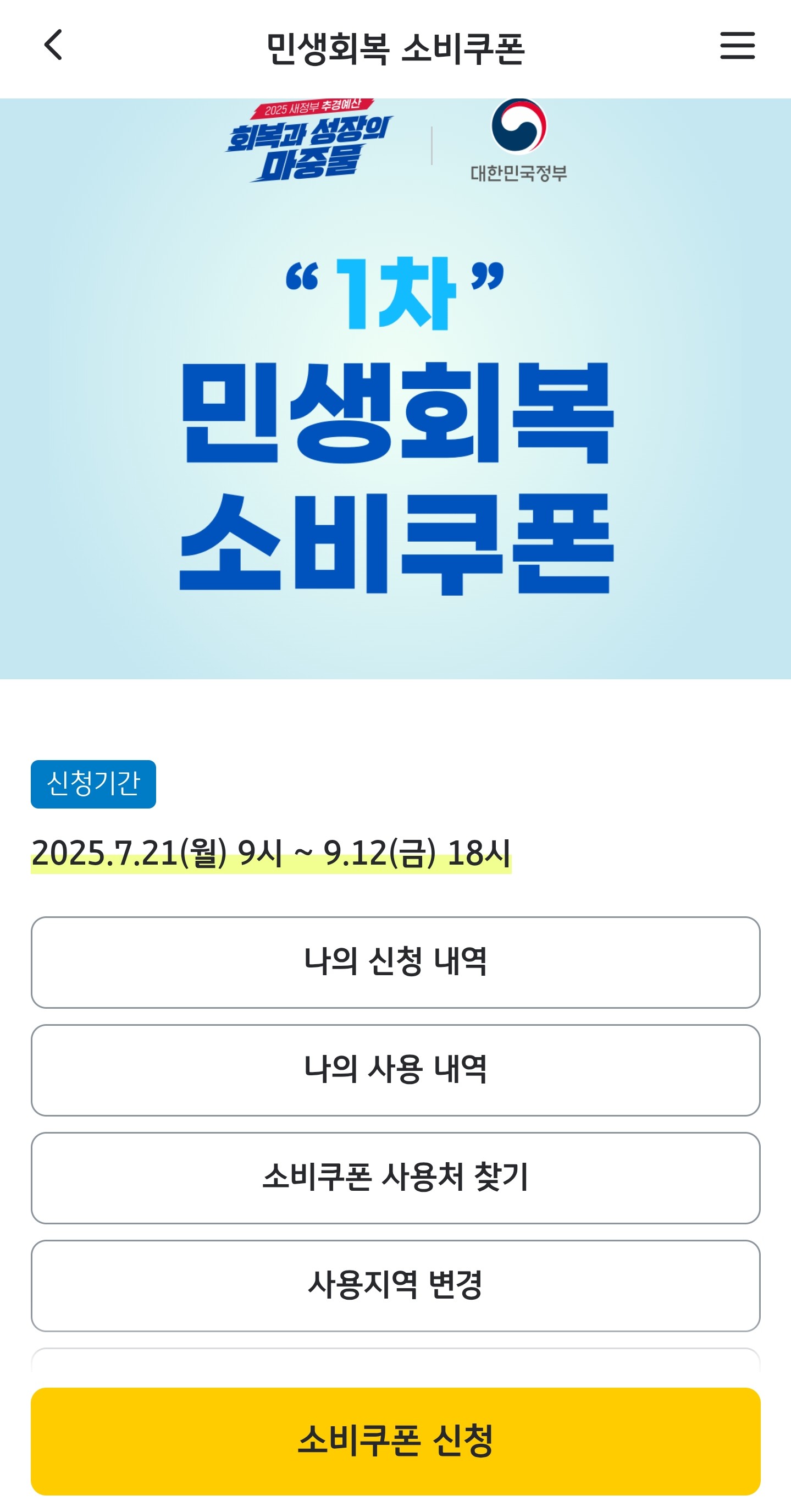다음으로 소비쿠폰 신청 이라고 되어있는 하단의 노란색 박스를 클릭합니다.